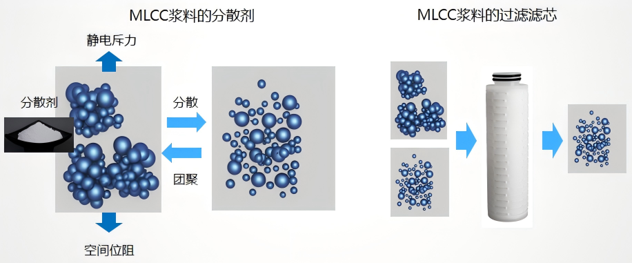 怎么解決MLCC漿料的團聚呢?解決方案一般有兩個,第一個,就是分散劑,簡單描述下分散劑的原理就是添加的分散劑成分,可以把團聚的顆粒,通過靜電斥力、空間位阻或者兩者的綜合作用來分散開。但是因為漸進效應的存在,團聚顆粒在被分散過幾次后,最終會形成團聚和分散的動態平衡。那么在動態平衡之后的顆粒團聚如何解決呢?這里就需要用到第二個解決方案,用濾芯過濾掉團聚的顆粒。