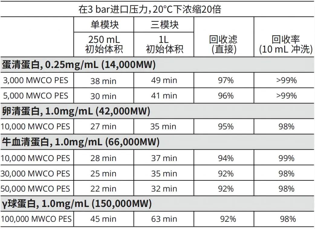 下面是我們配置了四種不同濃度的蛋白溶液包括蛋清蛋白, 0.25mg/mL (14,000MW)、卵清蛋白, 1.0mg/mL (42,000MW)、牛血清蛋白, 1.0mg/mL (66,000MW)、γ球蛋白, 1.0mg/mL (150,000MW)等,用我們不同分子截留的單模塊和三模塊的PRISM 50超濾膜包進行截留,實驗條件在3 bar進口壓力,20℃下濃縮20倍,其平均直接回收率在94%以上,在10mL沖洗的條件下平均回收率達到98%以上,其過程對純水的通量總體恢復非常穩定,沒有明顯的下降趨勢。
